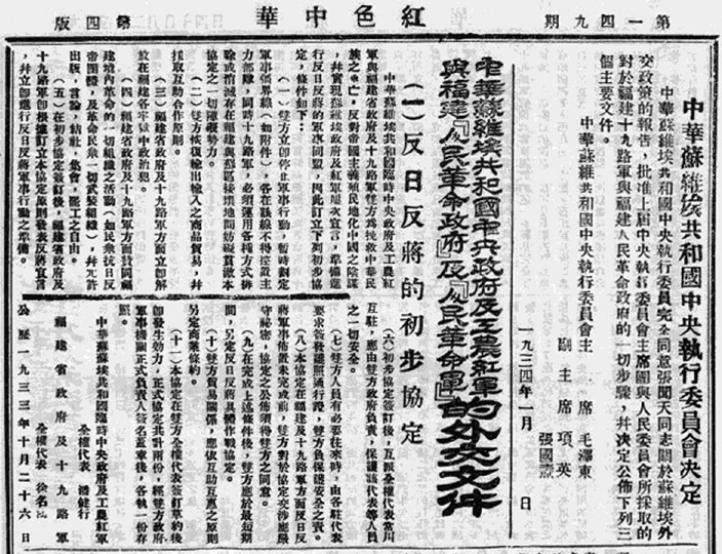 经过多次接触及谈判,红军代表潘汉年(化名潘健行)与19路军代表徐名鸿草签了包括“停止军事行动”“恢复商品贸易”“释放政治犯”“发表反蒋宣言”“互派全权代表”等为主要内容的《中华苏维埃共和国中央政府、中国工农红军、福建人民政府、人民革命军反日反蒋的初步协定》(简称《初步协定》)。