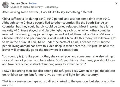 紧接着另一位中国网友表示,在1949年之前,中国遭受了许多苦难,当时中国一直处于战争状态,随着难民越来越多,他们并没有选择去到其他国家,而是选择留下来继续做斗争。