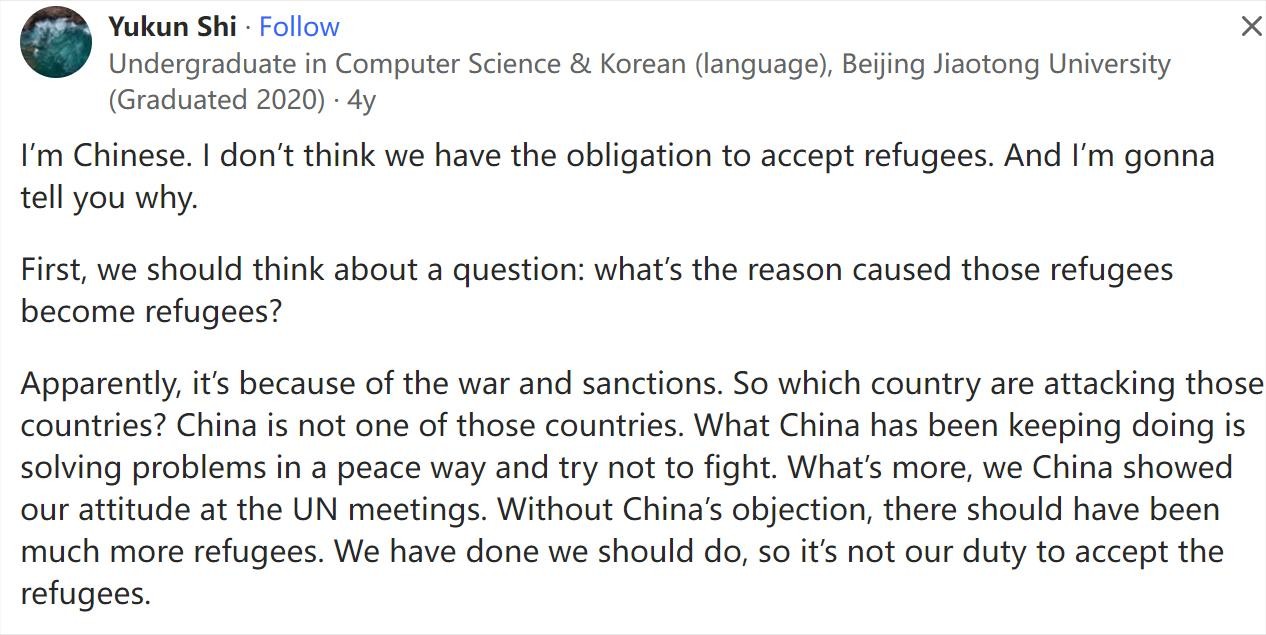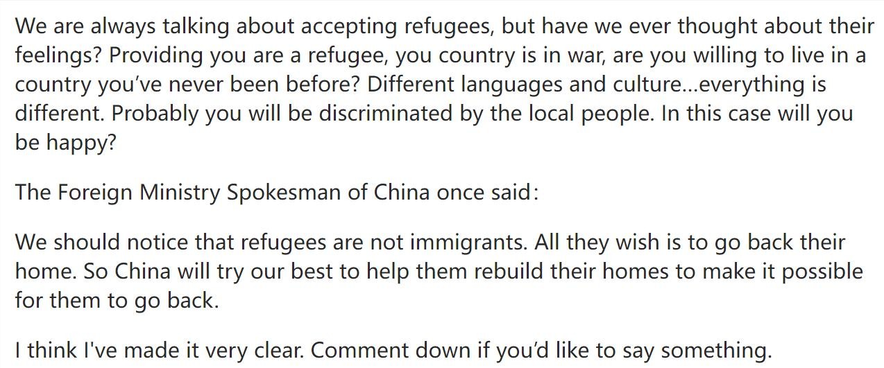 随后另一位中国网友表示,我是中国人,我认为我们没有义务接受难民,因为无家可归的难民根本就不是中国造成的,是什么原因到他们成为了难民,显然是战争和制裁。