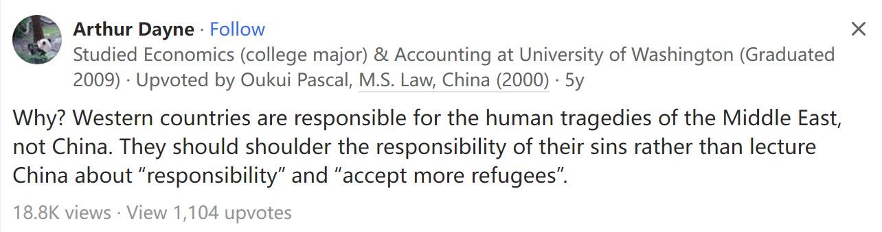 而不少外国网友认为,应该让中国接收这些难民,毕竟他们四十年没有打仗,环境肯定十分安全,于是其中一位外国网友便在美版知乎Quora上提问:“中国应该接收难民吗?”