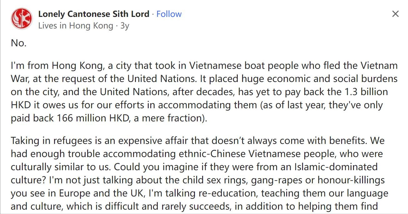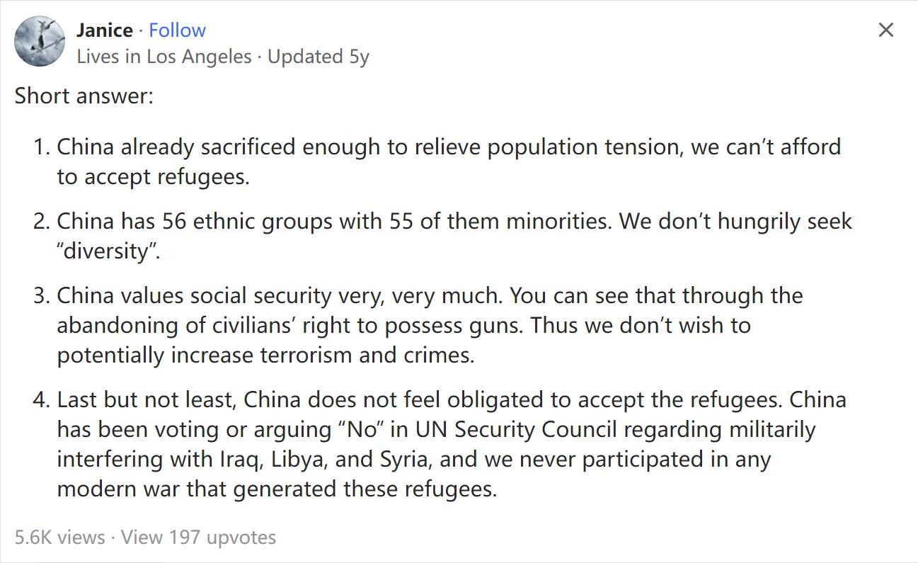 紧接着一位来自洛杉矶的网友评论道,我来为中国做一个简短的回答,中国为了缓解人口紧张局势而做出了很大的牺牲,他们根本无力接收如此多的难民。