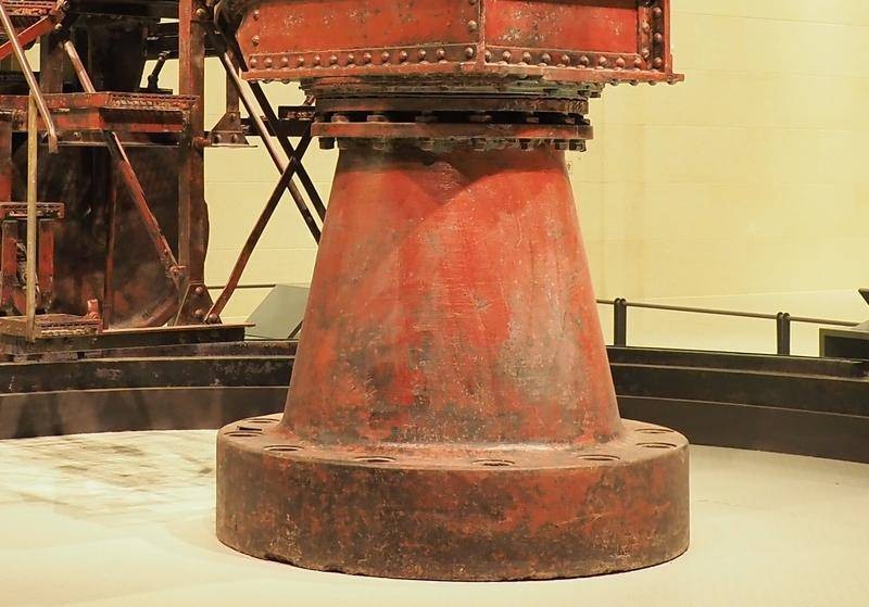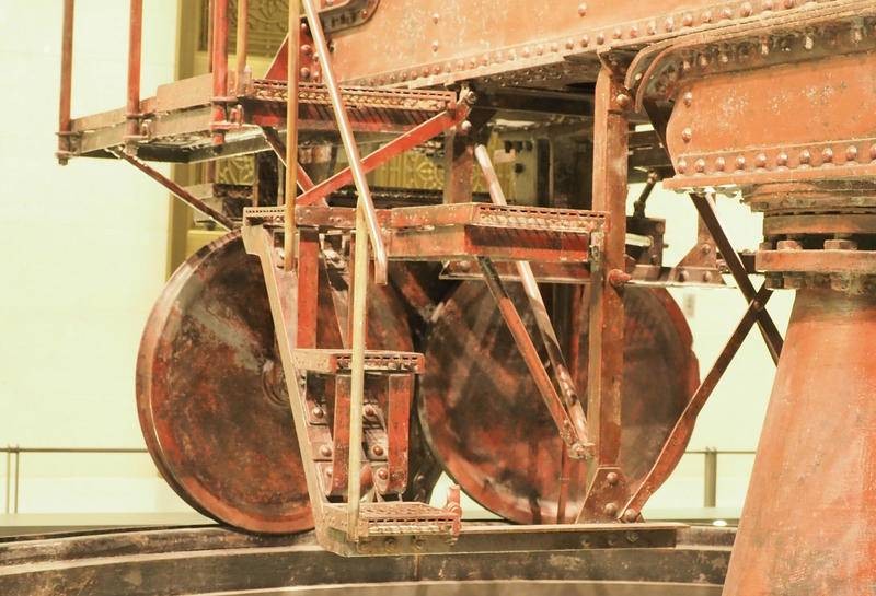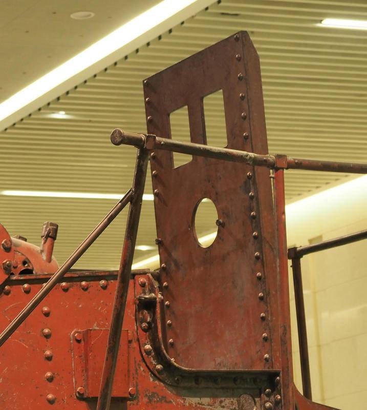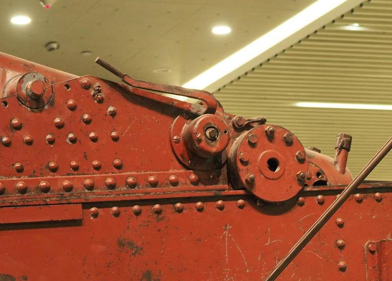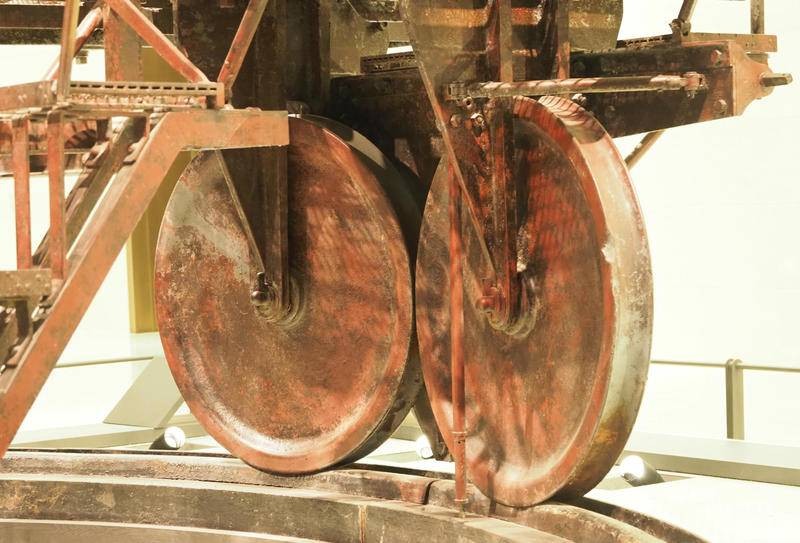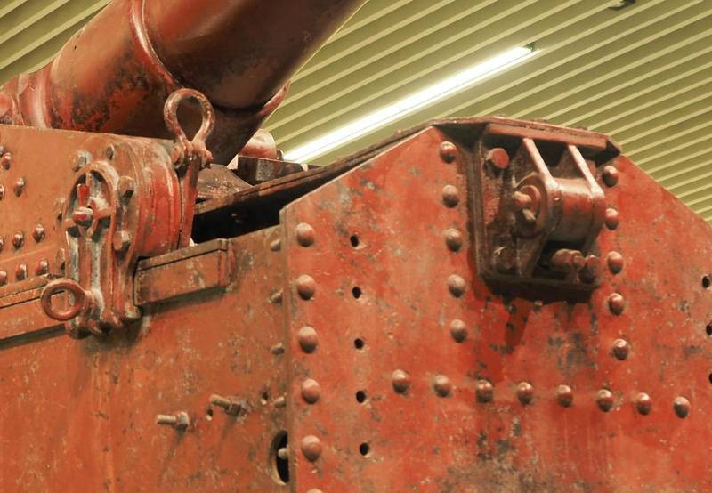 克虏伯要塞炮安放在可旋转的炮位上,炮架下方有塔式中心柱支撑,中心柱底座固定顶端可旋转。下方铺设有半圈钢轨,能180度调整射击角度。如此庞大的炮架如何转动呢?查看照片细节,并没有发现任何机械传动的装置,看来该炮为人工转手轮靠连杆带动绞盘一点点移动方向。