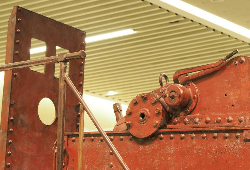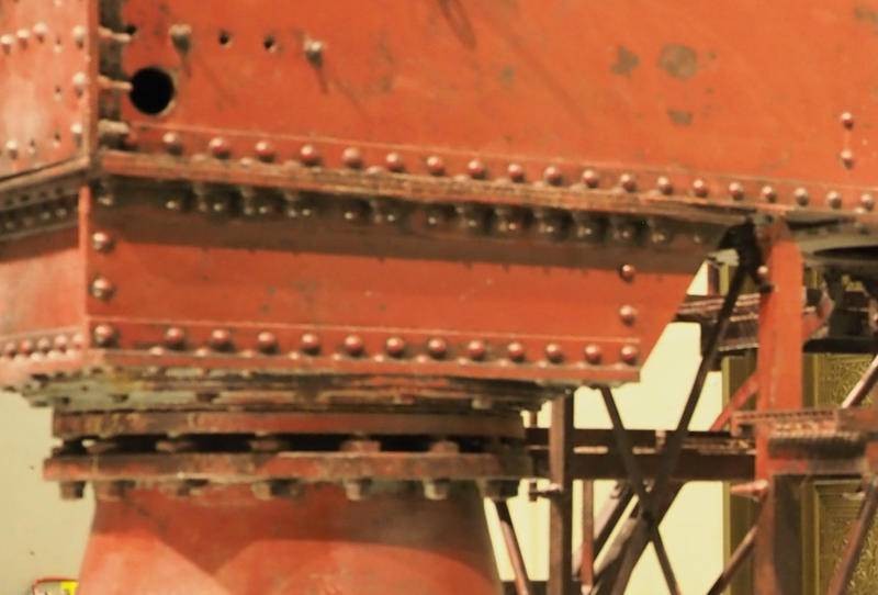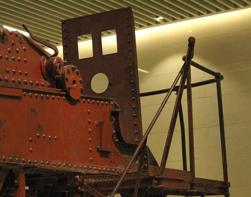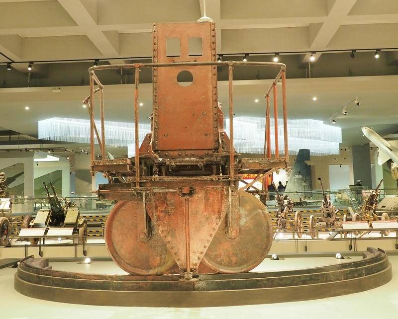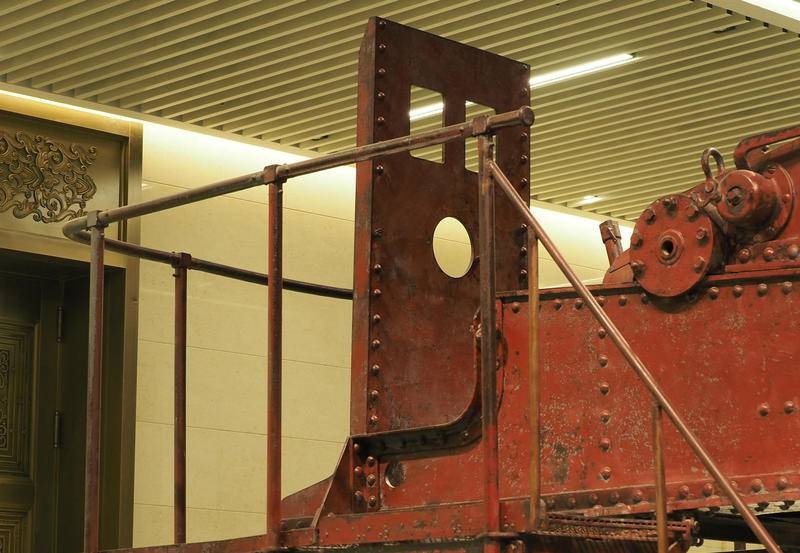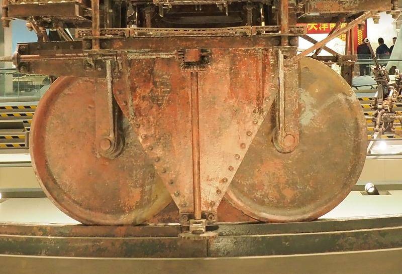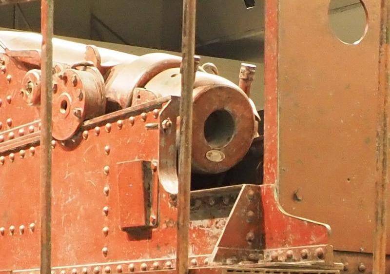 该炮高低角移动更费劲,照片显示炮身固定在三角型钢架上,钢架后端有类似千斤顶式的手动闸柄,向后拉炮口可抬起。但因炮身太重绝对不可能抬高炮口,所以在三角钢架前端安有垫脚式控制闸铁,每拉一次闸柄前后联动脚垫式控制铁闸向后移动,将炮身顶高反之可降低。照片中可见三角钢架利用加固滑轨可前后移动,为保证炮身平稳有支撑钢板贯穿前后垫在三角钢架中间。