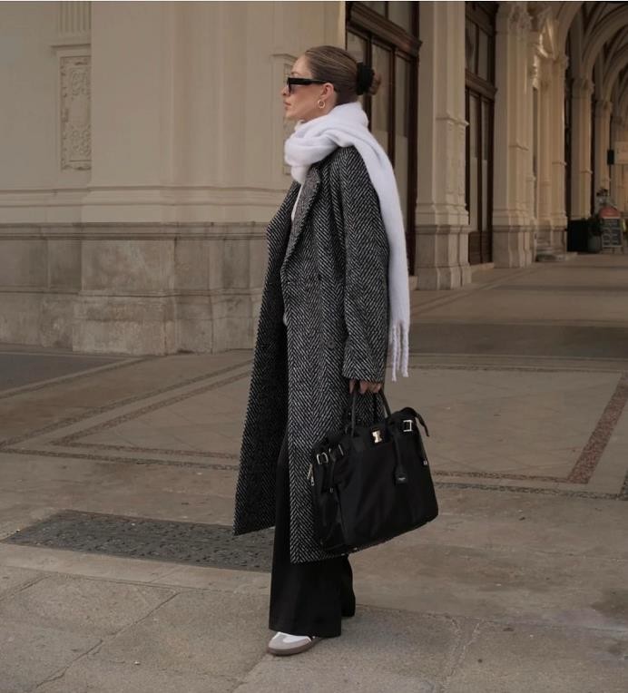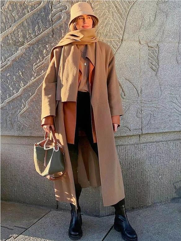今年高级灰的大衣一如既往受欢迎,谁让它这么百搭呢,在配色上,尽量选择基础色来配就行,黑色、白色或者是同色。