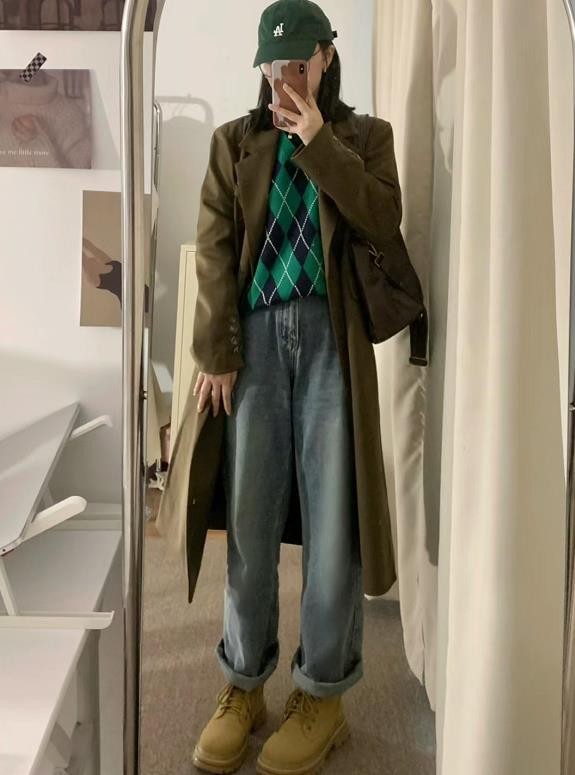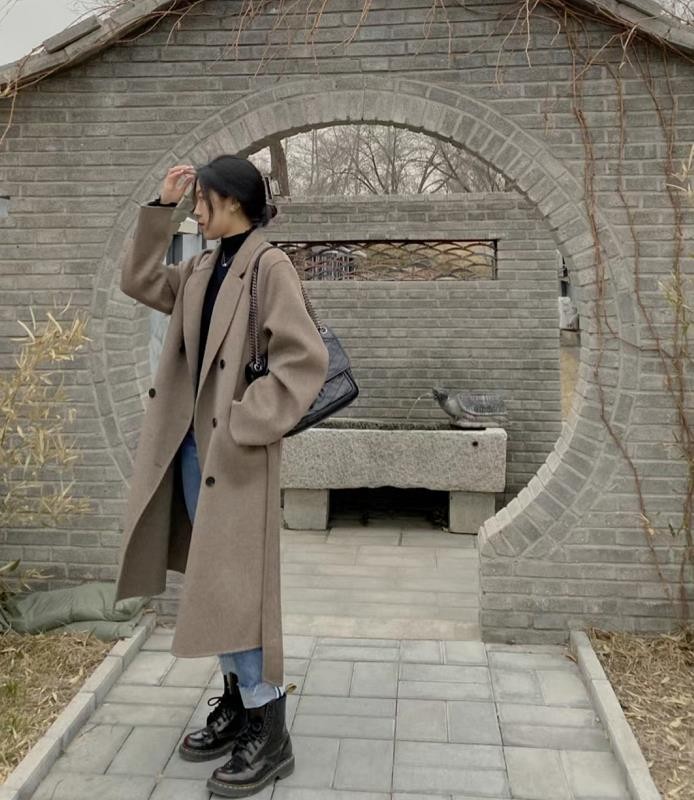 大衣+马丁靴的组合,就是秋冬最时髦的穿法之一了,下装可以配半身长裙,也可以简单选一条牛仔裤来搭,腿型不笔直的姐妹,直筒版型最合适。