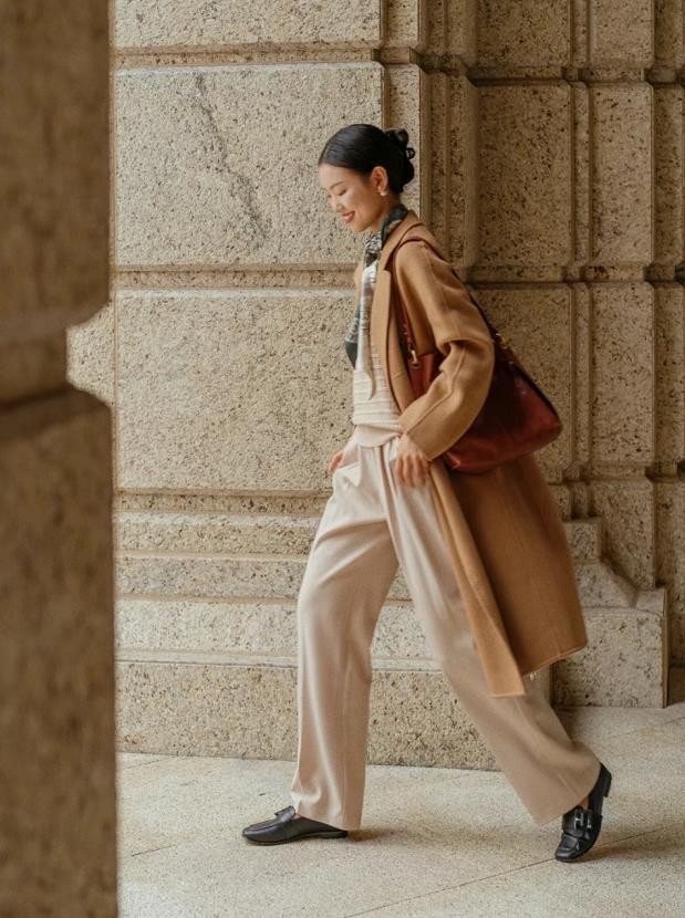 乐福鞋在秋天或深秋都是很适合穿的,建议加上一双袜子,这样就能保证一定的穿着温度,驼色的大衣看起来真的很显优雅。