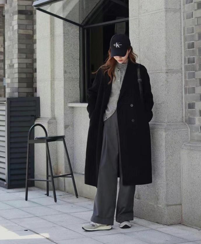 一套连小个子也可以驾驭的穿搭,长款大衣+黑色九分裤,九分长度的裤子,可以拉长腿部线条,同时显高挑。