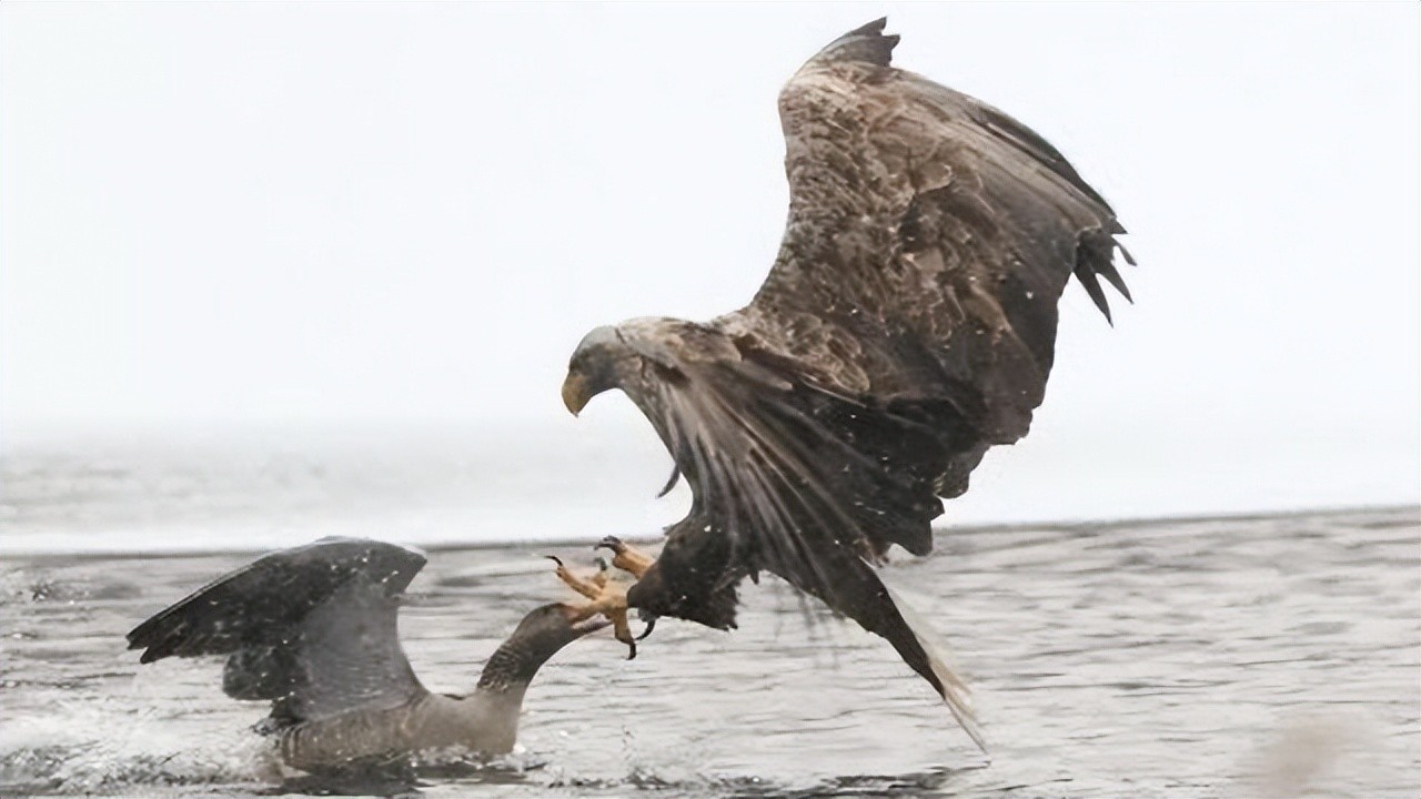 2016年的时候,这场大战似乎又有了延续,在加拿大温哥华岛一只白头鹰狠狠骑在一只大鹅的身上,本以为胜券在握,没想到竟然被大鹅猛的掀翻,然后逃进了水里,大鹅进水之后,白头鹰就开始踟蹰了,一番犹豫之后不敢下水,只得恨恨飞走。