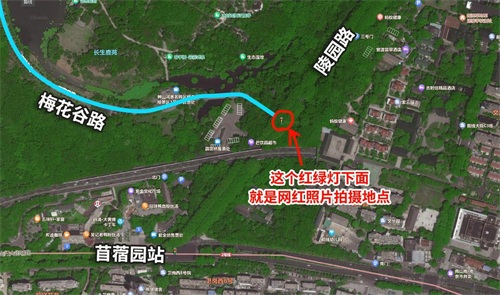 抖音上,梧桐大道网红照片和视频的拍摄地点,在梅花谷路和陵园路交汇处的红绿灯下面。