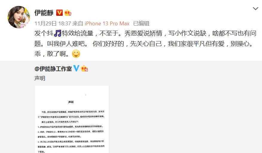 不过,这一次,伊能静并未沉默,而是亲自发文辟谣与秦昊离婚传闻。