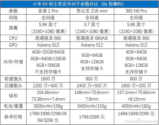在价格方面,坚果2 Pro和努比亚Z18 mini的性价比都要逊色于小米6X,而360 N6 Pro的低配和中配版则要比小米6X便宜100元,但顶配版却要比小米6X贵了100元。