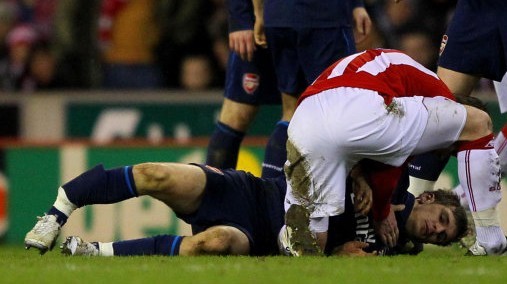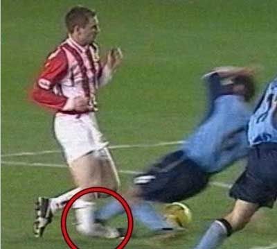 曼联的阿兰史密斯是红魔的铁血队长,球场上有名的硬汉。在2006年的足总杯与利物浦的双红会交锋中,史密斯上前封堵红军重炮手里瑟的任意球,皮球击中他的支撑腿,造成胫骨骨折和踝骨脱臼。修养半年多之后重新复出的阿兰史密斯没有了以往的球场霸气,告别豪门生涯。