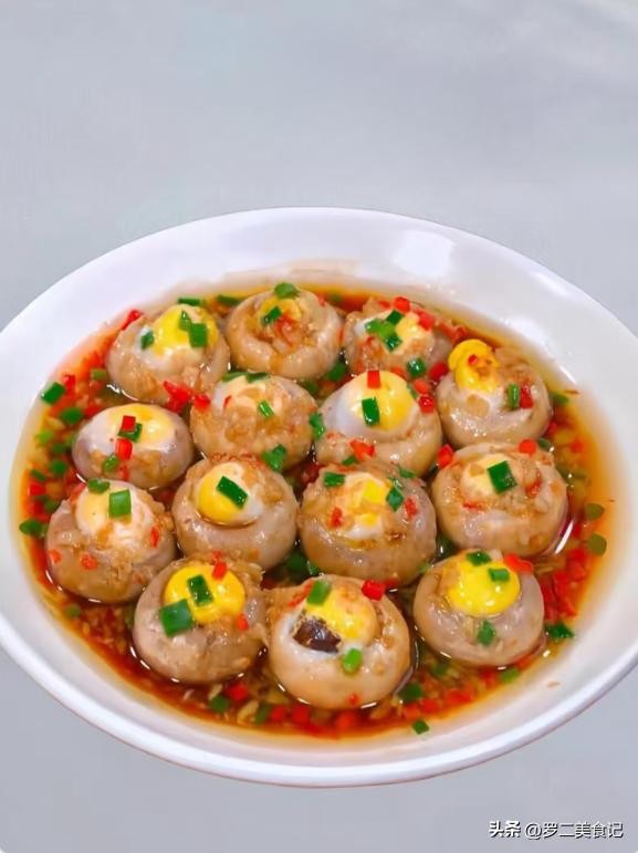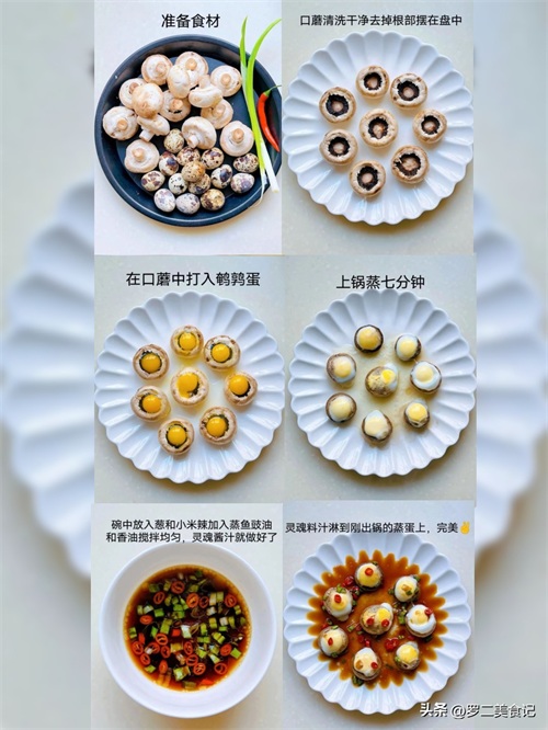 材料:适量口蘑,适量鹌鹑蛋,葱段 ,一根小米辣,香油,蒸鱼豉油。