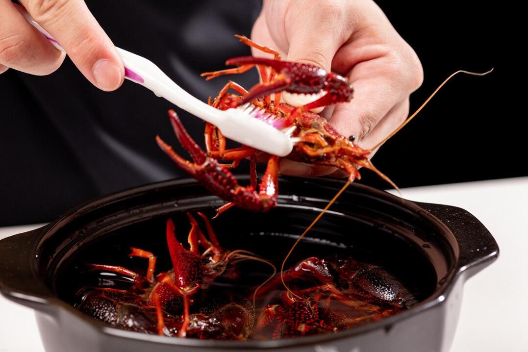 第二步,泡好后,我们拿一把刷子,把小龙虾每个部位、每个角落,都搓洗一段时间,特别是肚子的部分,会更脏一些,一定要刷洗到位,全部刷洗好以后,再用清水冲洗一遍,就可以啦。