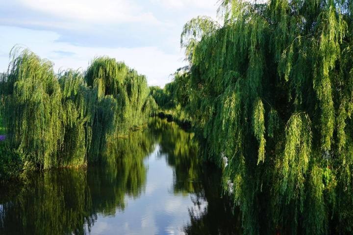 河水清浅碧绿,岸边的垂柳倒映在河面上。微风拂过,婆娑的柳枝摇曳生姿,轻轻划过水面,荡起层层波纹。
