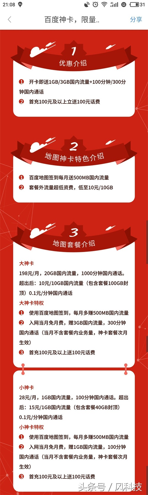 百度大小神卡提供高流量多通话和少流量少通话两种高低套餐选择。流量和通话全是国内不分省内省外,28元即送1G流量和100分钟通话,还是比较实惠的选择。