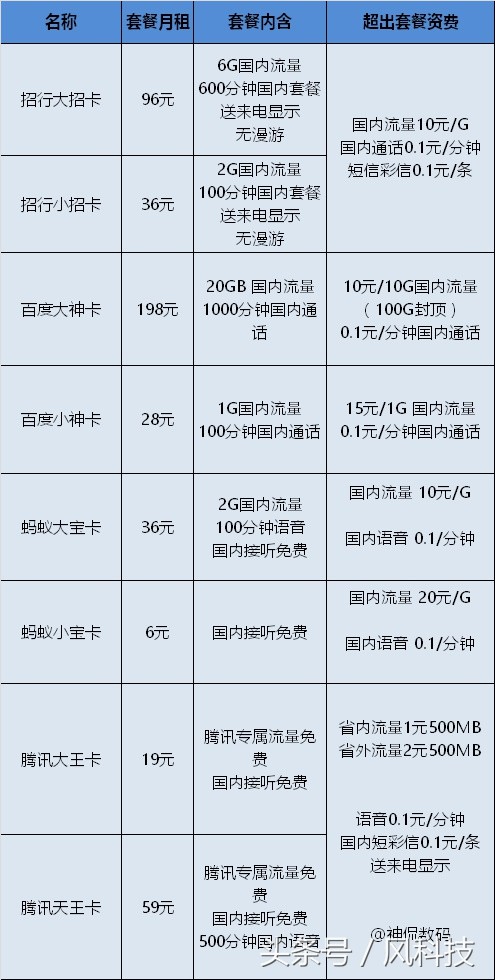 流量和通话业务较多的朋友们可以考虑百度大神卡、招行大招卡;中等流量需求和通话需求可以再招行小招卡、百度小神卡、蚂蚁大宝卡中选择;作为副卡使用的选择剩下的最佳。