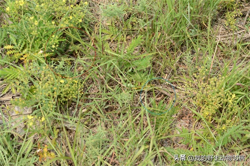 后来我将拍到的照片在电脑上放大,仔细寻找后才在小草和枯叶间发现少许暴露出的鳞片。如果事先不知道有蛇藏在其中,根本无 法发现它的存在——白条锦蛇真的是潜伏高手!