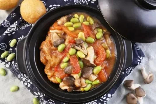 什蔬面筋煲 -材 料-莲藕、油面筋番茄、毛豆平菇、水淀粉油、盐、生抽