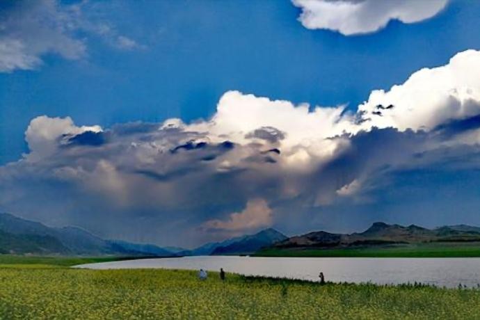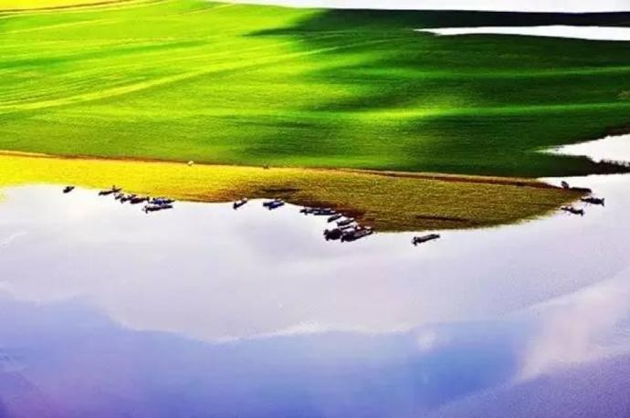 这里有花海草浪。初夏,水没地萌发了密密麻麻的各种各样的小草,小麦、油菜也初绽嫩芽,先给水没地披上了淡淡的绿纱,亦透迹露,朦朦胧胧,继而变成无垠的绿地。花也分期开放,大碗花开时,草地上飘荡着紫色的云,油菜花开时,无边无际的金黄……白鸟临水立,渔舟搁岸斜。牛羊也点缀在上面,这时的绿江风景妩媚多姿,淡妆浓抹总相宜。成熟的小麦滚动着金色的麦浪,让人心醉,让人痴迷……