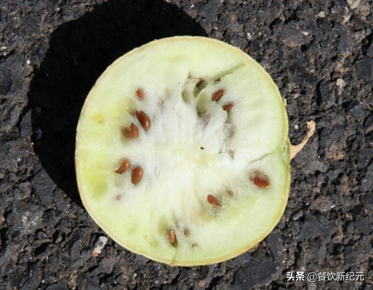 药西瓜个头比普通西瓜更小一点,颜色偏黄,西瓜的纹理模糊不清,切开之后,里面的瓜囊呈现白色,并不是普通西瓜的红色,而且西瓜籽有点像颜色偏黄,有点像黄豆。