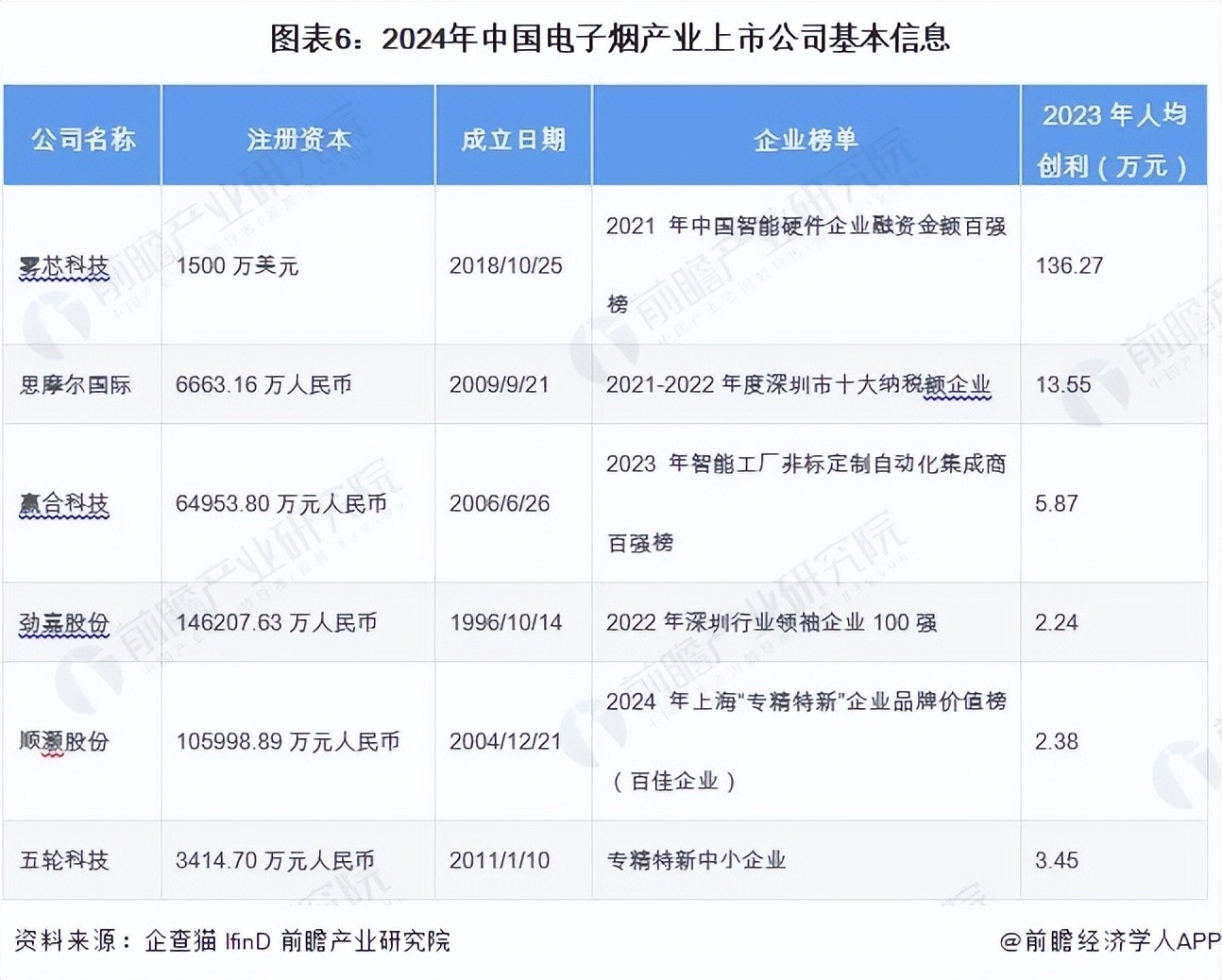 从电子烟产业链的上市企业布局和已有公开信息分析,电子烟品牌上市制造商主要包括:雾芯科技、劲嘉股份、顺灏股份、思摩尔国际、赢合科技、五轮科技、小崧股份等。在自有品牌制造商中,劲嘉股份注册资本最高,约146207.63万人民币,顺灏股份成立日期最早,2004年12月在深圳注册成立,雾芯科技人均创利最高,2023年人均创利136.27万元。