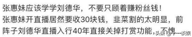 有人直言,让张惠妹学习一下刘德华,人家天王线上演唱会都是免费,而张惠妹开唱却要付费观看,完全是割粉丝的韭菜。当然也有粉丝认为,一切都是自愿,如果你觉得30块钱花得值,就去看,况且也没人强迫你。