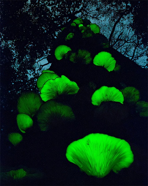 发光的真菌生长在木头上,它们的光在夜间可见。发光的高等真菌发出绿光,最大发射范围为 520-530 nm。这种夜光蘑菇只在其生命周期的某个时期发光;