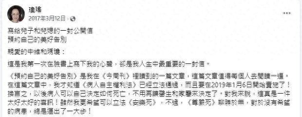 据媒体报道,琼瑶秘书淑玲在琼瑶社交媒体脸书的粉丝专页代为发布了琼瑶遗书,内文提及自己已经“翩然”离去,希望外界不要为她难过。“遗书”称“我不想听天由命,不想慢慢枯萎凋零,我想为这最后的大事‘作主’。”文中还称自己曾目睹将死老人插管维生的“惨状”,她不要那样的死亡。