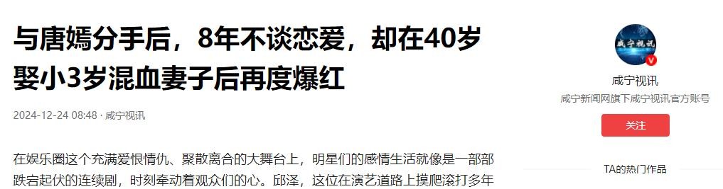 在与唐嫣分手后,邱泽经历了长达八年的感情空窗期。在这八年里,他仿佛消失在了爱情的舞台上,没有传出任何新的恋情绯闻。
