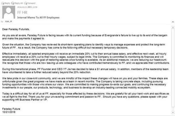 FF内部的邮件显示, FF陷入经济危机,全体员工的年薪将降低20%,同时还要进行裁员。创始人兼CEO