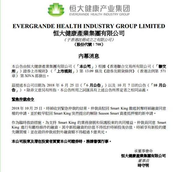 在恒大健康的公告中,有如是表述:香港国际仲裁中心否决了彻底剥夺恒大融资同意权的要求,并否决了FF临时提出接触FF资产抵押权的新要求;仲裁员还裁决,同意Smart King(FF公司实体)进行有严格条件的融资,其中新股融资的估值不得低于时颖(恒大健康全资子公司)投后估值,时颖享有新股的优先购买权;并在最终仲裁前对外融资额不得超过5亿美元。