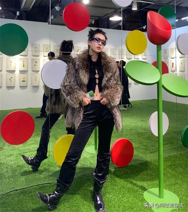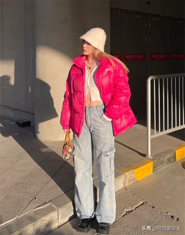 吸睛的芭比粉羽绒服配上白色内搭,下半身是低调的蓝色低腰裤,配上黑色厚底鞋,这样穿也太辣了!