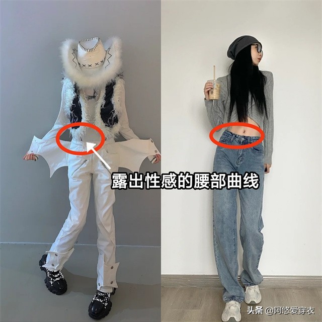 搭配低腰裤时一定要露出腰部曲线,或者是通过露肤的方式露腰,这样穿才好看哦~