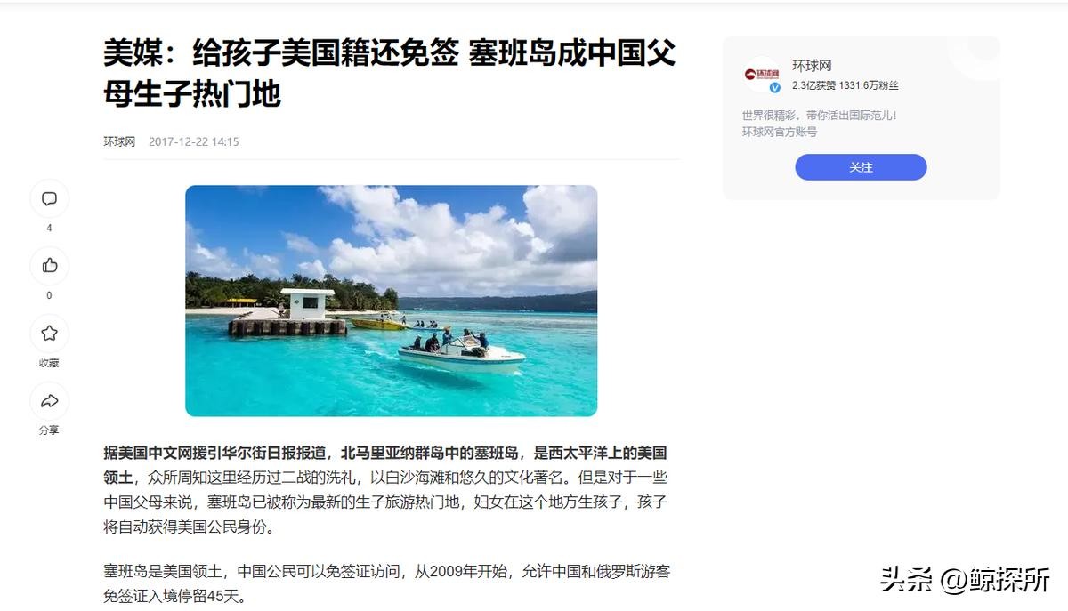 环球网 《美媒:给孩子美国籍还免签 塞班岛成中国父母生子热门地》2017-12-22