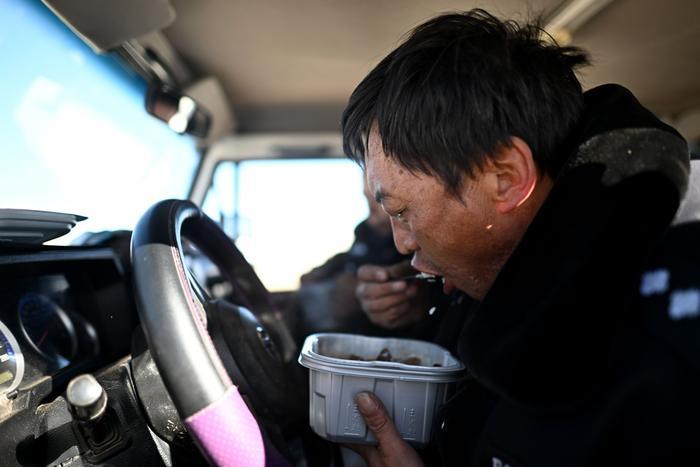 在可可西里卓乃湖区域附近,可可西里森林公安局巡山队员尼玛扎西在巡护途中吃饭(1月19日摄)。新华社记者张宏祥摄