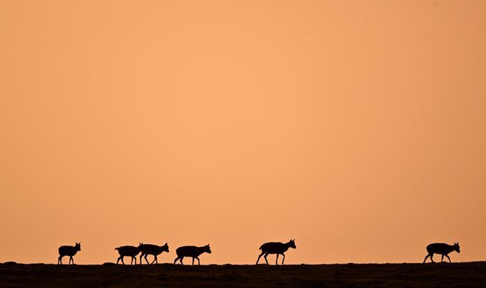 一群藏羚羊在可可西里卓乃湖区域活动(2023年6月18日摄)。新华社记者张宏祥摄