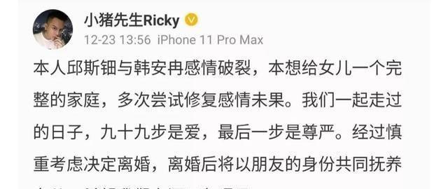 12月24日,韩安冉宣布和小猪先生离婚,并连发几条微博诉说自己的心情。