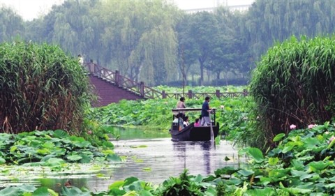 行走在荷塘月色湿地公园中,清风徐来,荷香扑鼻。在公园入口处的西荷塘内,游客乘坐小船体验水乡采莲的诗意,品尝清甜的莲子,有的还带上几片新采的荷叶回家;公园乌篷船码头平台上,船娘穿戴水乡服饰向游客售卖着莲蓬和莲叶;田田莲叶中,睡莲、花莲、子莲、热带王莲,各种荷花争奇斗艳,有些小荷才露尖尖角,有些早已亭亭玉立。