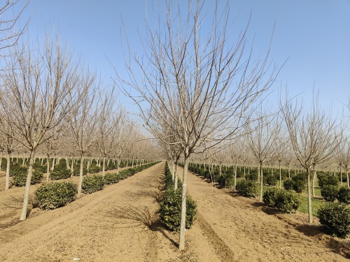 在扶风元宝枫试验示范基地附近一处树林,一行行元宝枫整整齐齐“站立”,横竖间距均5米。这里是宝鸡绿美枫彩园林绿化有限公司的种植基地,公司负责人乌乃奇说:“这种5×5的种植方式,有望让今年的元宝枫种子产量每亩超过1吨,即成为‘吨果田’。”