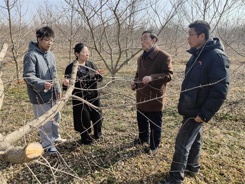 在位于陕西省扶风县的西北农林科技大学元宝枫试验示范基地,西北农林科技大学退休教授王性炎(右二)调查元宝枫种质资源选育情况(2025年2月25日摄)。新华社记者 姚友明 摄