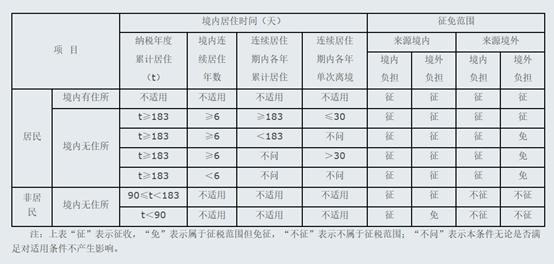 简单来说,非居民怎么纳税,纳多少税取决于在中国待多长时间,如果在中国连续工作超过六年,且每年呆满183天,期间出境一次不能超过30天,这样从某种程度来说可以算中国常驻居民了,那么自己你在国家的收入也要合并在我国纳税了。所以这个很好规避,只要这个外国人年度内有一次出境超过30天,纳税年限就得重新计算。如果想规避境内所得由境外支付这部分的个税,那么这个外国人不能在中国待够90天。有一张表格可以比较清晰地显示上述逻辑关系: