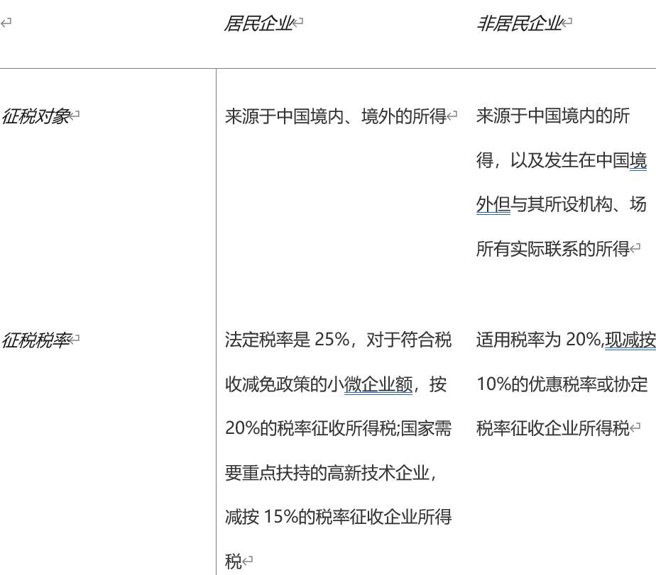 从企业方面来说,居民企业与非居民企业纳税区别主要体现在征税对象及税率这两方面,具体可见下表: