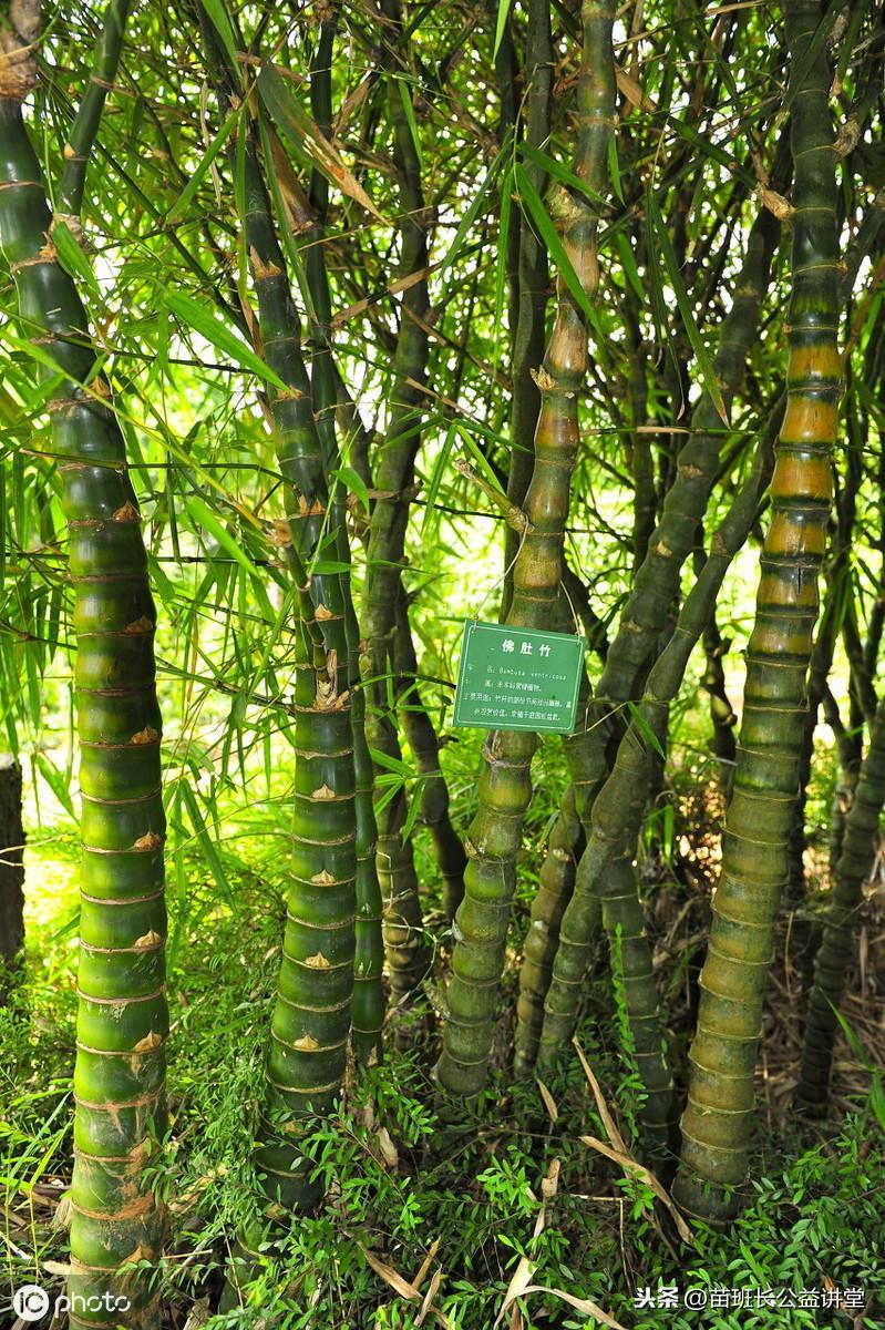 形态特征。佛肚竹,又名大肚竹,秆多数呈电光状弯曲,如蛇形逆水,基部节间膨大,状如佛肚,形态奇特。佛肚竹为禾本科丛生型竹类,幼秆深绿色,稍被白粉,老时转黄榄色。秆圆筒形,高2至5米,直径3至5厘米,节间较短,一般为10至15厘米。其种类有小佛肚竹和大佛肚竹之分,前者竹秆矮小,节间短缩膨大,形似“佛肚”;后者竹竿较大,径达8厘米,秆及枝节间短缩肿胀呈佛肚状。